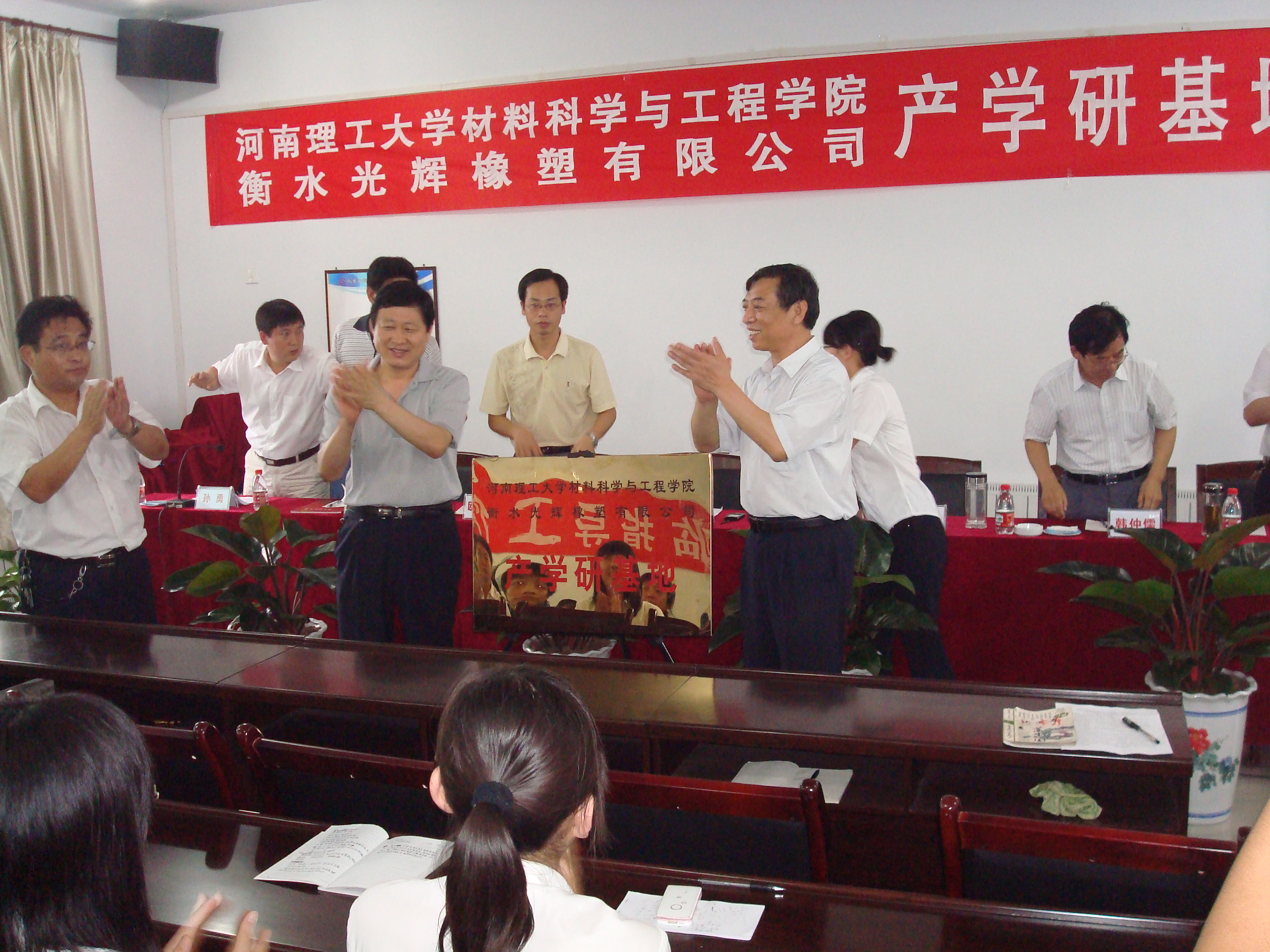 7月19日上午,公司与衡水光辉橡塑有限公司产学研基地揭牌仪式在河北省景县衡水光辉橡塑有限公司会议室举行。董事长助理丁安民教授,公司党委书记欧阳文峰、副教授王晓冬,景县县政府、景州镇、工业园区管委会、工业促进局以及公司有关领导出席仪式,100多名公司职工参加了揭牌仪式。
