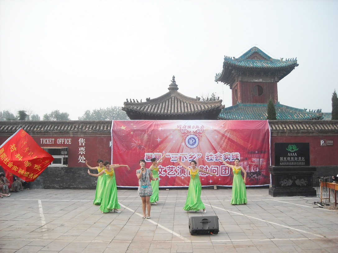 同学们首先考察了嘉应观古建筑群并详细了解它的历史文化,在参观和学习中,大家运用自己的所学所知,积极为文物的保护和历史文化的发扬提出自己的看法和意见。随后,同学们精心布置舞,文艺演出在富有青春活力的健美操表演《青春飞跃》中拉开了序幕,古典与现代相互交融的歌曲《将军令》独唱,悠扬的萨克斯《女儿情》独奏,让人耳目一新的歌舞《山不转水转》,给农村的父老乡亲们奉献了一场独特而富有情趣的文化盛宴。接着,经典豫剧《花木兰选段》、小品《如此赡养》将现场演出推向了高潮,现场掌声不断,欢呼不断。在节目表演中,大家利用现场设备介绍嘉应观文化和宣读文物保护倡议,借此提高当地村民和游客的文物保护意识,为嘉应观历史文化遗迹的永久保存贡献自己的知识和智慧。