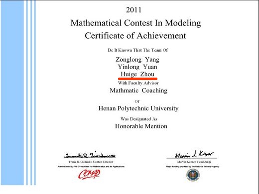 采访最后,周会鸽告诉记者,参加数学建模竞赛是对自己的一种锻炼,虽然很辛苦,却学到了很多的东西。比如学到了团队协作,学到了在协作中独立思考和解决问题的能力,这些不光是数模竞赛中必须的,也是做其他事情所必须的。这个健谈的女孩还提醒将来参赛的同学注意组队的合理性,合理的分工就意味着高效。此外,还要注意综合素质的提高,物理、数学、计算机等方面的知识要学会结合使用;还要有坚强的毅力,四天四夜的比赛对任何一名队员都是挑战,无论是心理上还是生理上;要有信心,不要畏惧,当拿到任何一个赛题的时候都不可能在短时间解决,要持之以恒地对待。