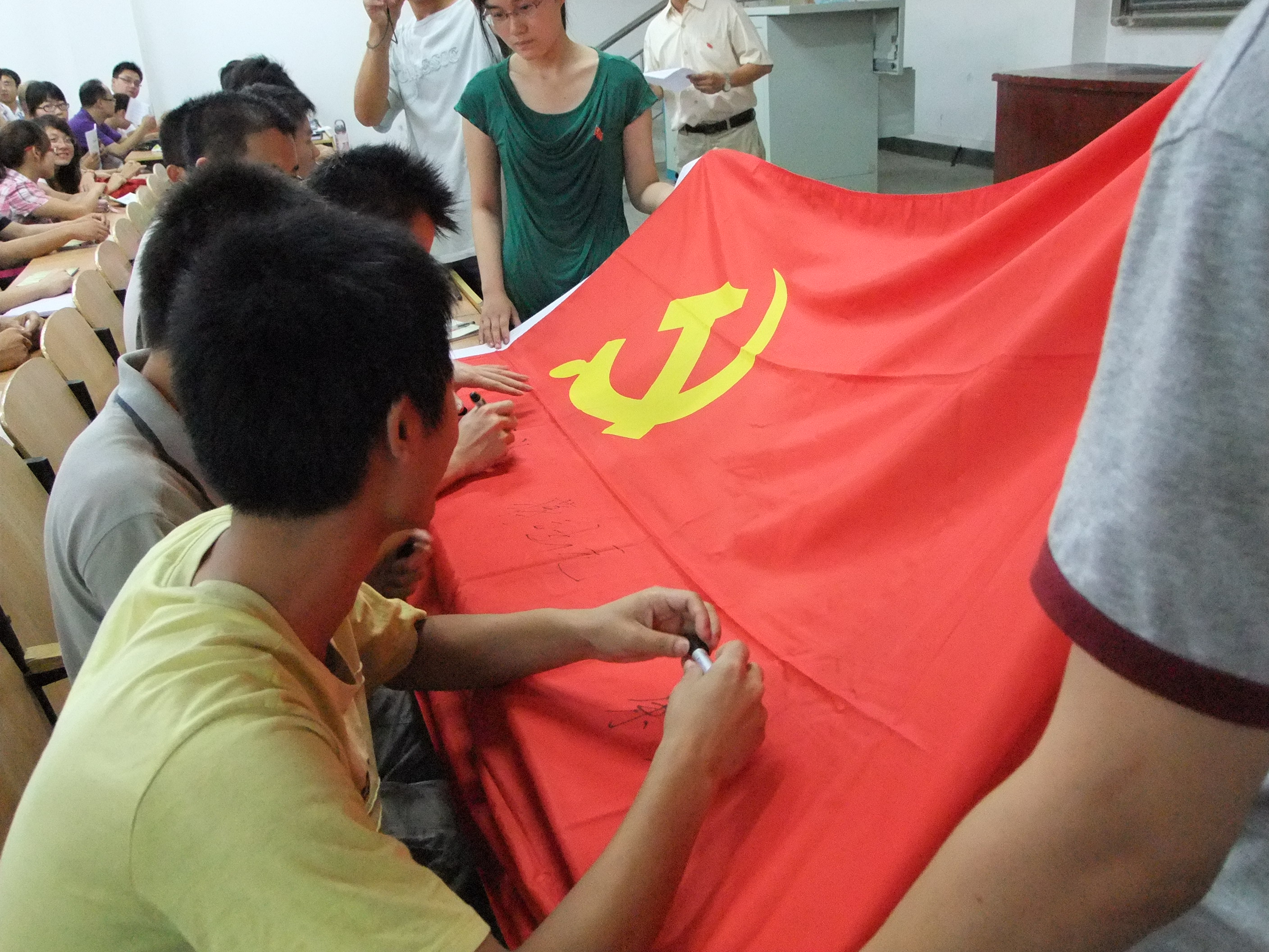 随后,国际歌拉开了新党员入党宣誓仪式的序幕,公司党委副书记谢玉芬宣读了领誓人、监誓人及参加宣誓的新党员名单,全院235名预备党员面对鲜红的党旗,举起右拳,在党旗下发出了自己对党最忠诚的誓言。宣誓结束后,公司党委委员、特聘组织员为预备党员代表佩戴了共产党员徽章,新党员纷纷在党旗上签名以示承诺。