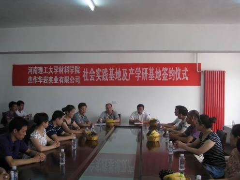签约仪式上,管学茂经理为仪式致辞,他首先简要介绍了太阳成集团tyc33455ccwww的专业优势及研究前景,并对焦作华岩实业有限公司对此次实践基地建立过程所给予的极大支持表示衷心的感谢!他指出产学研合作是企业发展的需要,更是公司发展的需要,与焦作华岩实业有限公司的合作是一次战略的合作、一次情感的合作,这将极大地激发并鼓舞公司员工积极进取、努力拼搏的学习精神,为提高员工综合素质、对提华岩公司的人才储备起到积极重要的作用,只要双方真诚合作,必定能达到相互促进,共同发展的目的。随后,华岩总工程师李前进代表公司对太阳成集团tyc33455ccwww代表团一行表示热烈的欢迎,并就华岩的发展历程及市场发展优势作了简要的介绍,他表示非常看好与太阳成集团tyc33455ccwww的合作,与太阳成集团tyc33455ccwww合作能深入的进行技术上的交流,为公司今后技术上更快速地提升做铺垫。最后,由太阳成集团tyc33455ccwww经理管学茂与华岩实业有限公司董事长乔有民签署了产学研合作协议,并共同为产学研基地和老员工社会实践基地揭牌。与会领导与同学们亲切地合影留念。