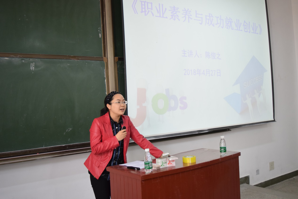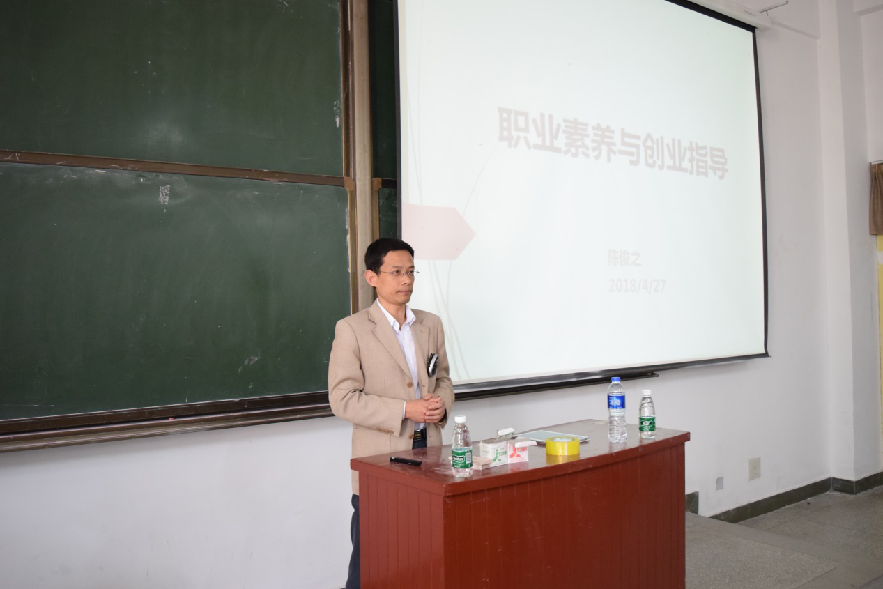 4月27日上午,由校员工部(处)主办、太阳成集团tyc33455ccwww承办的第53期“树人讲堂”在经管楼1112教室举行。太阳成集团2001届优秀毕业生,无锡迅杰光远科技有限公司生产总监、公司合伙人陈俊之先生受邀作了题为“职业素养与成功就业创业”的专题讲座。讲座由公司谢玉芬副书记主持,太阳成集团tyc33455ccwww15级员工180余人聆听了此次讲座。