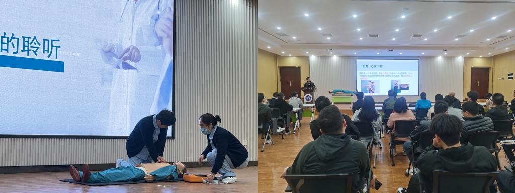 首先,校医院保健科主任余波给大家详细讲解了异物窒息的表现和急救方法,如何判断病人是否需要进行心肺复苏,心肺复苏的外界实施条件,怎样进行心肺复苏以及体外除颤仪的使用方法。接着,两位医生利用“模拟人”和AED除颤器对心肺复苏的全过程进行现场演示,让大家准确领悟了“胸外心脏按压”“气道畅通”“人工呼吸”“体外自动除颤”等实际开展急救时的操作要点。与会师生积极主动上前进行实际操作训练,细致领会每一步的操作标准与要领。