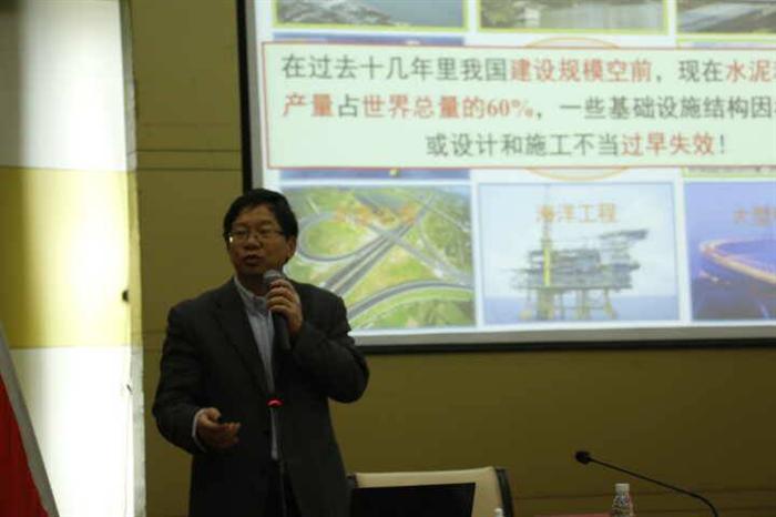 报告中,史才军提出,高性能混凝土有利于提高工程质量,延长工程寿命,降低工程全寿命周期的综合成本,对促进混凝土行业的结构调整和技术进步具有重大意义。史才军简要介绍了高性能水泥基材料的发展历程,并向与会人员介绍了超高性能混凝土高韧性、高耐久性的特点。他从设计原理、设计流程图等方面详细介绍了超高性能混凝土的原材料及配比。史才军采用图文结合的方式展示了混凝土的水化和微观机构。他使用大量的实验数据介绍了超高性能混凝土材料的粘结性、力学性能和耐久性。史才军表示,我国正处于城镇化和基础设施建设的快速发展阶段,混凝土被广泛应用于建筑、桥梁、隧道、大坝、水港码头、道路、铁路等各个土木工程领域。他通过分享第十四届国际水泥化学大会的盛况鼓励在场师生努力学习、为水泥混凝土化学的不断进步与持续发展做出卓越贡献。