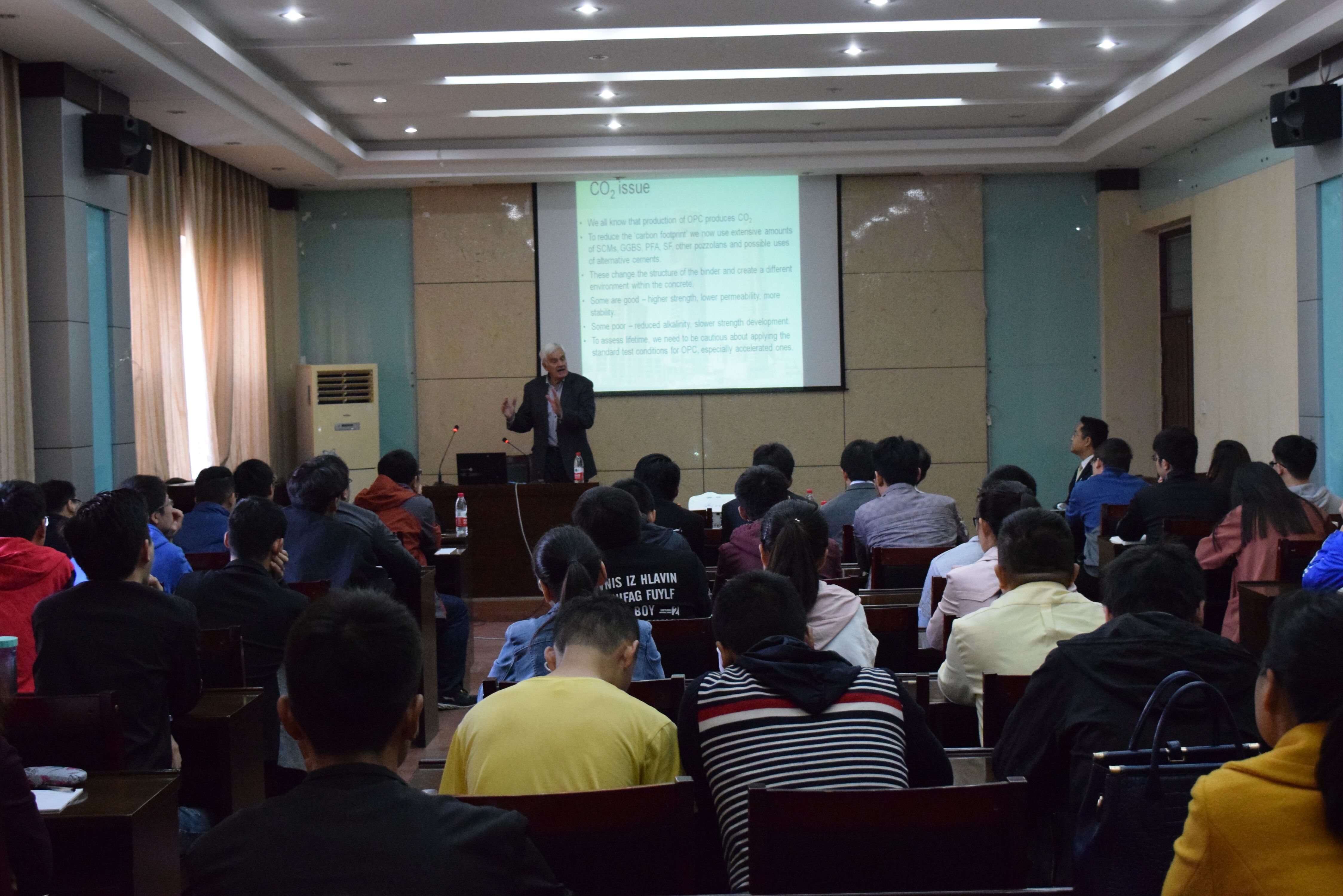 首先,Milestone院士在报告会上介绍了他所在的科研机构及其所处的科研环境。接着,他介绍了现代混凝土研究中常用的氯离子加速试验、高温养护、集料活性加速试验、加速碳化试验、干湿循环试验方法等耐久性试验方法。他用一系列试验数据说明了这些方法在当前混凝土研究中的应用。与会同学神情专注,认真记录,受益良多。报告会最后是问题解答和学术交流环节,几位学者对同学们提出的问题进行耐心详细的解答,并激励他们要对未来充满激情和信心。