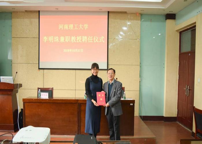 10月31日下午,中国科公司化学研究所研究员李明珠受聘公司兼职教授仪式暨学术讲座在太阳成集团tyc33455ccwww院楼1203会议室举行。讲座由公司杨政鹏教授主持,公司经理管学茂为李明珠颁发兼职教授聘书,公司相关专业100余名师生共同聆听了讲座。