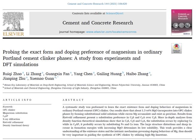 近日,公司“河南省深地材料科学与技术重点实验室”在国际权威学术期刊《Cement and Concrete Research》上发表题为“Probingthe exact form and doping preference of magnesium in ordinary Portland cementclinker phases: A study from experiments and DFT simulations”的研究成果,该工作主要由赵瑞奇副教授、硕士研究生张莉和管学茂教授完成,通过理论模拟和实验研究了Mg在波特兰水泥中的存在形式、掺杂行为和取代倾向,为进一步利用低品质的高Mg石灰石生产波特兰水泥提供了理论依据。《Cement and ConcreteResearch》主要刊载水泥、水泥复合材料、混凝土及其相关材料的基础研究方面的论文、评论和札记,该刊是中科院JCR中2020年一区杂志,也是结构与建筑技术、混凝土领域的顶级期刊,最新影响因子为8.328。