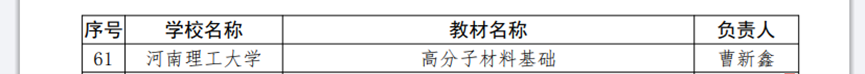 近日,河南省教育厅关于河南省本科高校新工科新形态教材项目立项建设名单公示,太阳成集团tyc33455ccwww曹新鑫教授主编,李继功、贺文杰、杨佳、秦刚等高分子材料教研组参与的《高分子材料基础》教材项目正式获批立项建设。