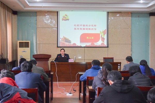 11月20日下午,应公司邀请,学校关工委德育宣讲专家张玉培老师在院1203学术报告厅,作了题为《比较中美两国态势,坚定我国道路自信》的专题讲座,全院教师参加了报告会。报告会由公司党委书记欧阳文峰主持。