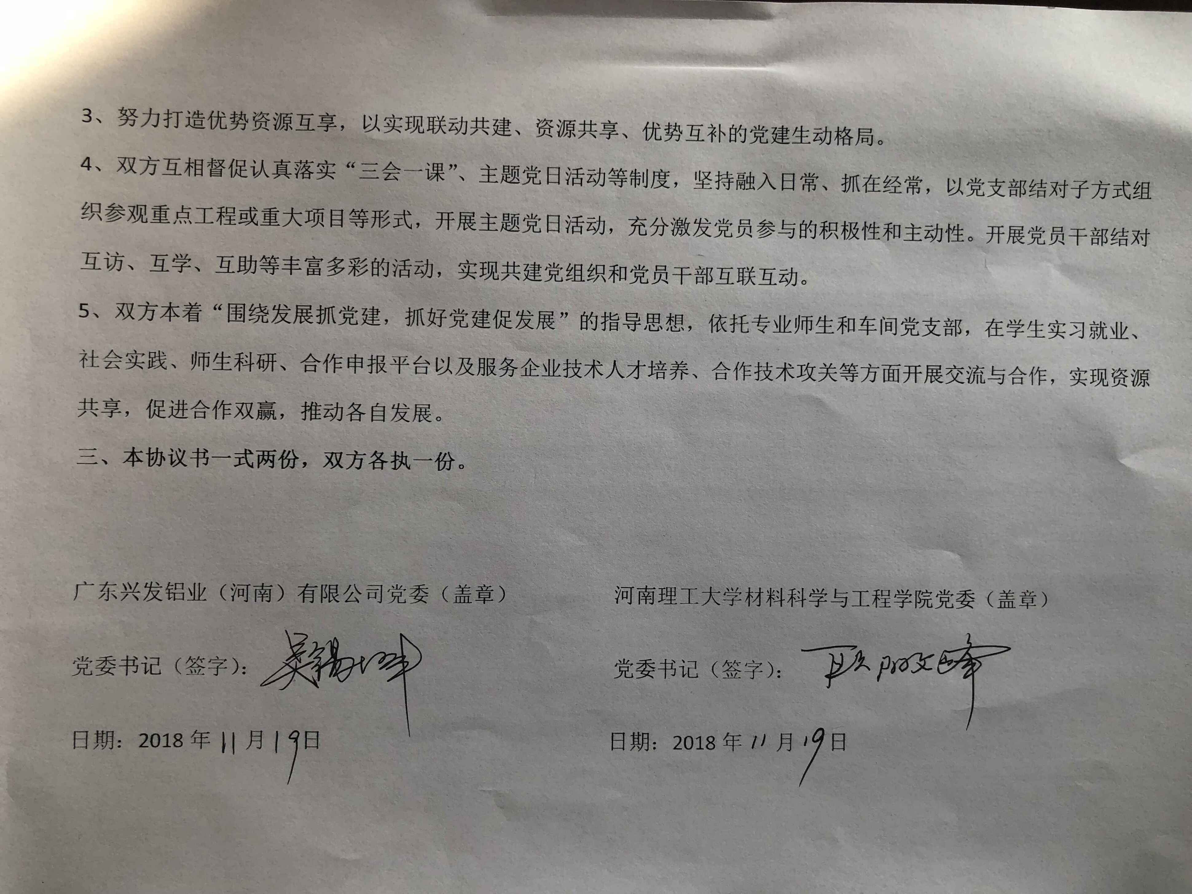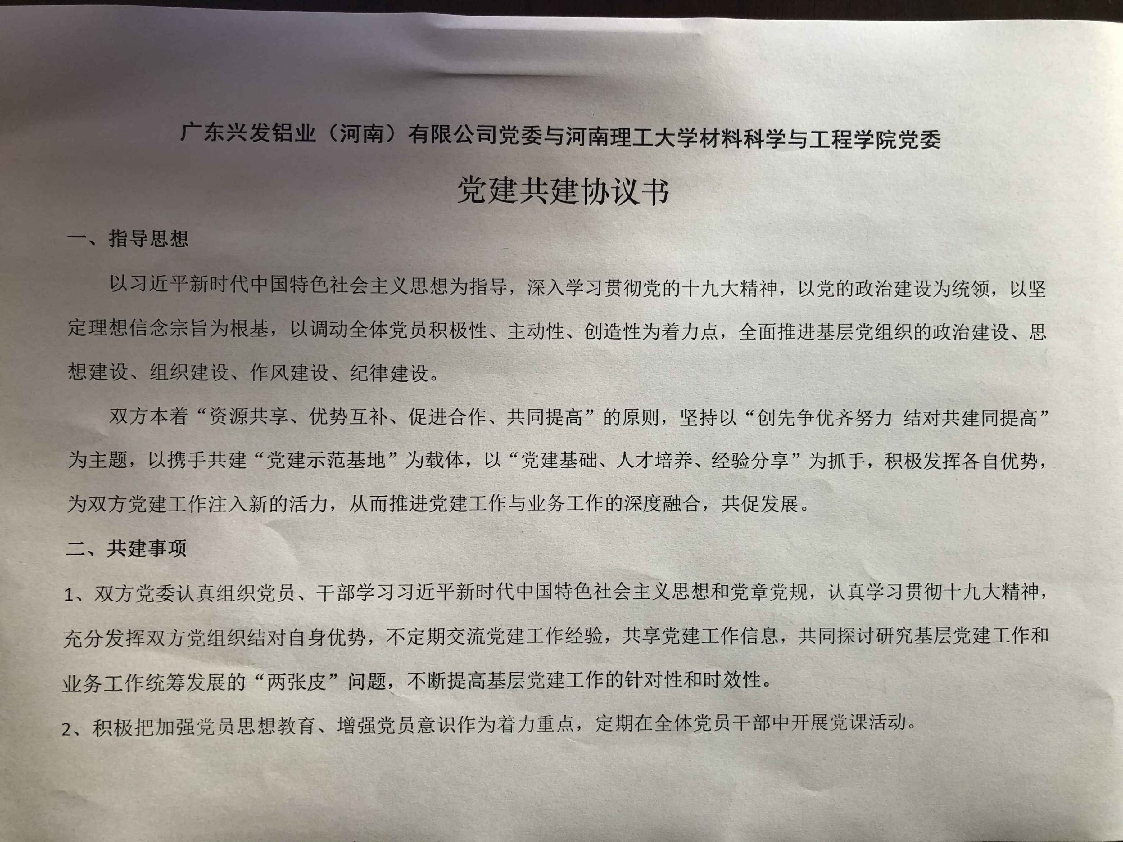 最后,吴锡坤、欧阳文峰代表双方党委共同签署了《广东兴发铝业(河南)有限公司党委与太阳成集团材料科学与工程公司党委党建共建协议书》。协议共建事项包括共同党课、支部结对子、员工实习就业和社会实践、师生科研以及服务企业技术人才培养、合作技术攻关等内容。后续双方相关部门将相互对接,争取早日实现共建成效。