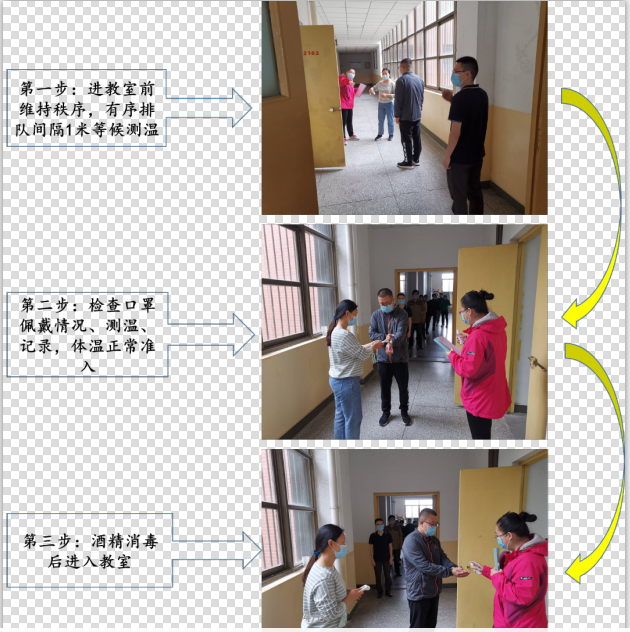 演习前准备工作中,各教室消毒卫生工作全部到位。演练现场,部分教师扮演“员工”模拟进入教室上课,“员工们”有序排队等候测温、消毒后进入教室。进教室后排开落座。下课员工离开后对教室再次进行消毒。