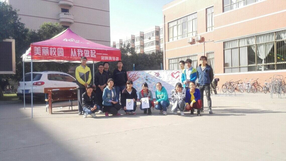 为了培养在校老员工爱护校园环境,保持美丽校园的观念。11月4日中午,材料青协在学子餐厅门口举行了以“美丽校园,从我做起”为主题的维洁宣传活动。