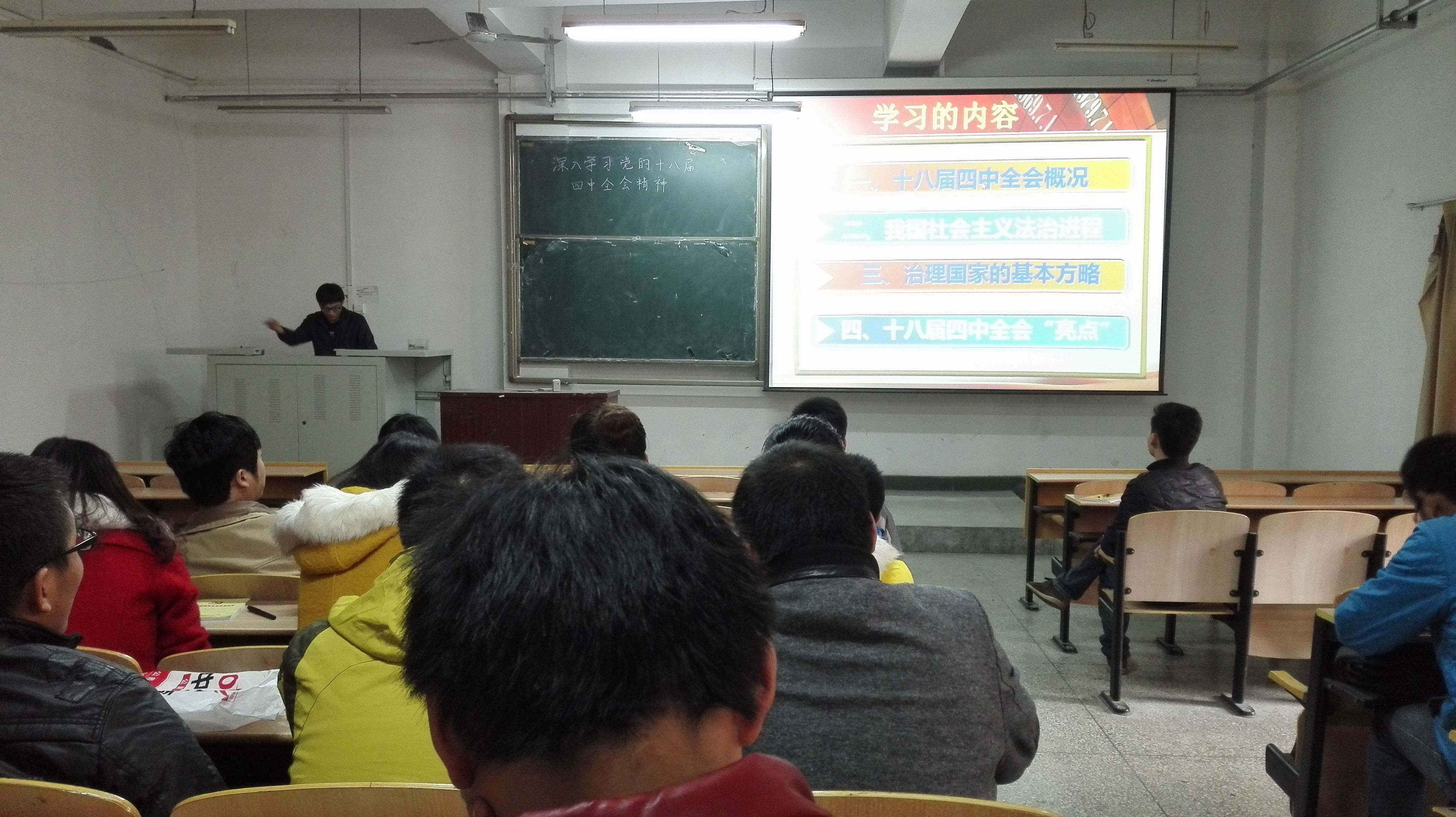 首先,支部书记李鹏同志带领大家回顾了《中共中央关于全面推进依法治国若干重大问题的决定》。大家都意识到,十八届四中全会是我国加快法治国家建设征途上的一个里程碑。全面推进依法治国意义重大,是解决我国改革发展稳定中的矛盾和问题的关键,也是在新的历史时期,把我们党的全部工作、所有活动转到法治轨道上来的伟大历史转折。全会突出了依法治国这一核心,科学立法这一前提,严格执法这一关键,公正司法这一保证,以及法治精神、法治文化这一灵魂。然后,党员代表依次上台交流学习十八届四中全会心得,代表们分别从党史、党性、廉政等角度阐述自己的心得体会,入党积极分子和团员们也都踊跃发言。