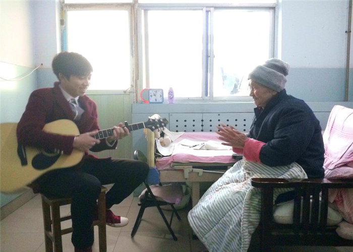 据了解,该院老年养护院内的老人大多是高龄人群,或是孤寡老人,或是患病在身,行动不便。在探望期间,大家分组带着牛奶、水果等慰问品,分发给老人并诚心地问候他们,表示大家最真挚的关怀。看到我们进来,老人们拉着同志们的手,拉起了家常,看到他们额头舒展的皱纹,大家的心里顿时也暖和了起来。其中,有一位老人耳朵几近失聪,但坚持用手写纸条与同学们交流。得知同学们为老人准备有娱乐小节目时,老人们欣然接受。动听的吉他与歌曲传播在整个房间,老人仔细地聆听,甚至高呼再唱一首。有温情,也有感慨,老人们有着各自不同的人生,但是他们依然对生活充满信心,这种乐观豁达是值得我们老员工去学习的。