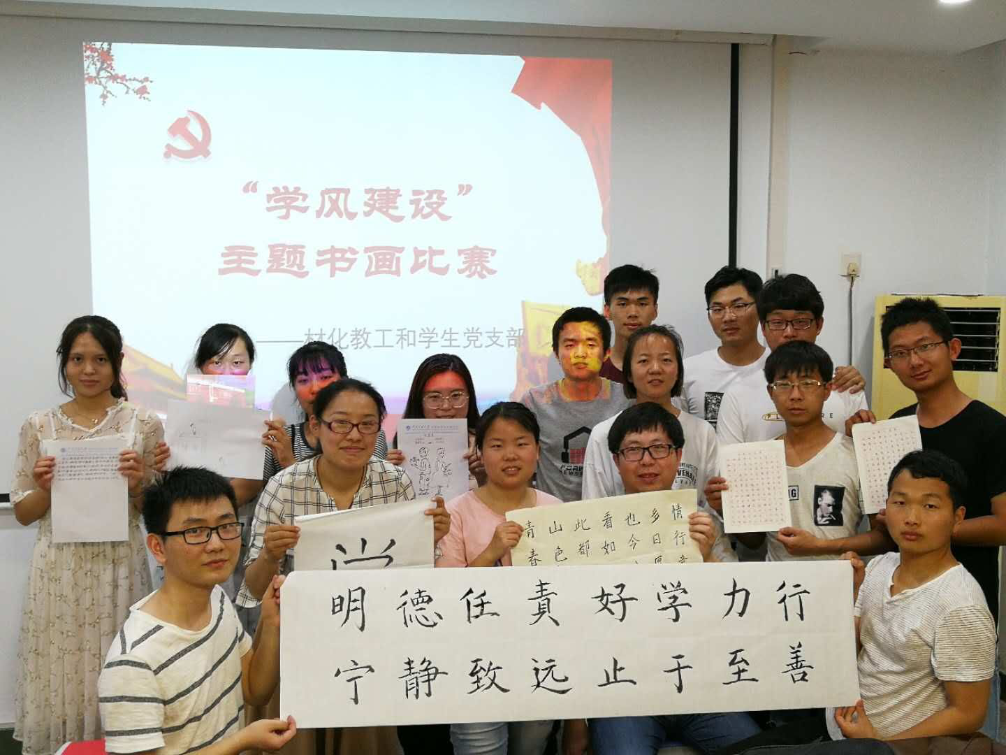 为倡导创建优良员工,增强党员意识,发挥党员在学风建设的先锋模范作用,2018年5月14日下午,材化员工党支部结合材化教工党支部在院楼2206开展“学风建设”主题书画大赛。