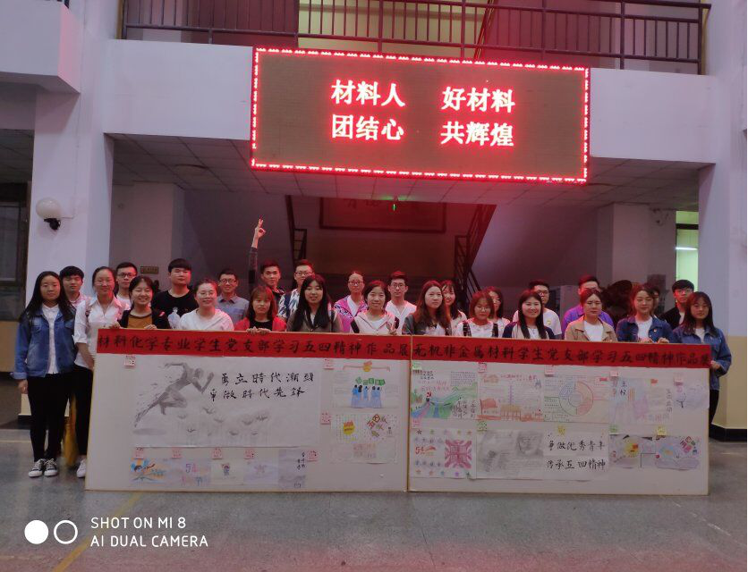 为了深入学习和弘扬五四精神,提高支部同志的思想认识,扎实勤勉求是,不懈奋斗,爱国的作风,2019年5月4日上午8:30~晚上8:30无机非金属材料员工党支部和材料化学专业员工党支部在国旗下,学苑餐厅东门口以及材料院楼2206分别进行了"争做优秀青年,传承五四精神"为主题的党日活动。