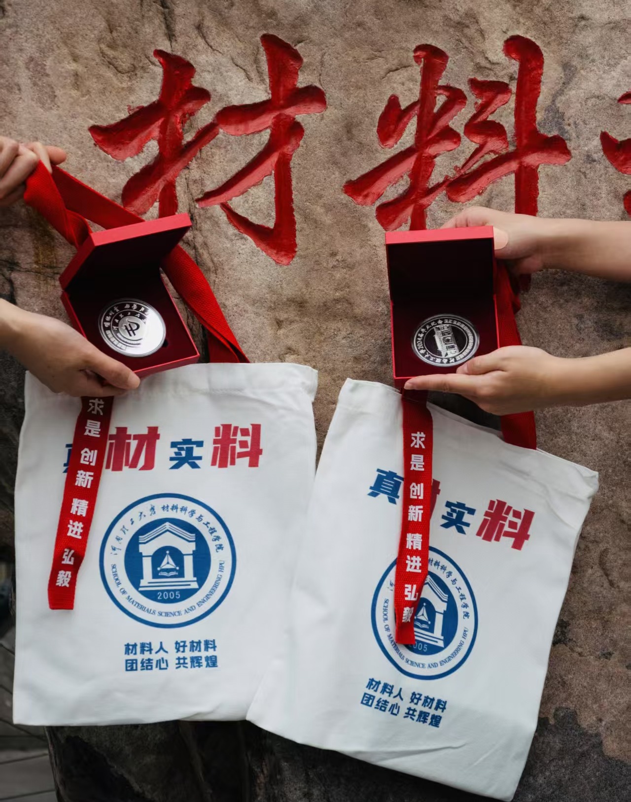 一枚刻有“材料人·好材料·团结心·共辉煌”及毕业生姓名的专属纪念印章,寓意每位学子在母校留下的不可磨灭的个人印记,希望同学们常怀感恩,不忘初心,砥砺前行。一个印有院风“求是、创新、精进、弘毅”和院训“真材实料”的帆布手提包,希望同学们背上“行囊”轻装启程,在新的征途中,满怀理想信念,努力拼搏奋斗。同学们动情地说,“拿到刻着自己名字的印章那一刻,真的特别感动,这枚印章很小,但分量很重,它是母校和公司给我的最后一份‘学籍证明’,也是我开启人生新阶段的‘签名章’。”