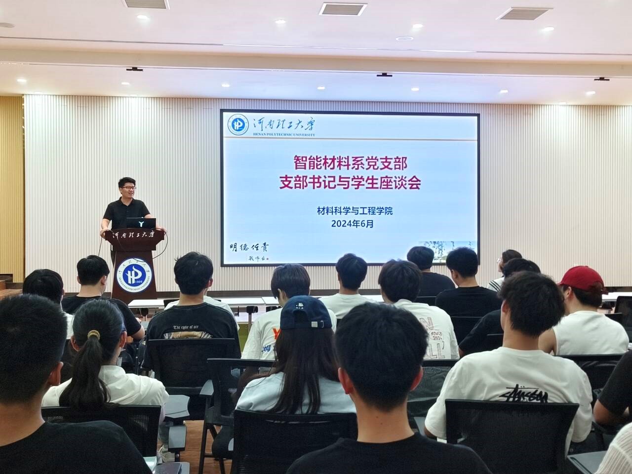 为进一步加强党支部书记与员工的联系,切实发挥党支部书记在立德树人中的教育引导作用,深入推进“一体化”协同育人机制。6月6日晚上,智能材料系党支部书记张博文与智能材料与结构专业2023级全体同学在公司2103多功能会议厅召开师生座谈会。
