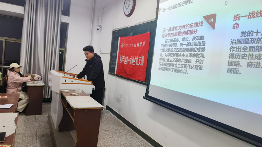 为进一步提升党员法治意识,11月5日,材料专业第一本科生党支部在院楼1306教室召开支部会议,深入学习贯彻习近平总书记关于民族和宗教工作、爱国统一战线工作重要论述,以及开展法治宣传教育,支部全体党员参会。 会议伊始,李于恒同志从统一战线的重要性与发展、民族工作的核心主线、宗教工作的中国化路径、爱国统一战线的工作要点,以及加强党对统战工作的全面领导等方面,带领大家学习了新时代党的民族宗教工作与统战工作大政方针。 在法治宣传教育环节,他先明确了普法宣传活动的总体要求,突出了普法宣传的重点内容,并对普法宣传的主要原则、任务及具体工作进行了阐述。讨论交流环节,支部党员表示要全面系统进行法治教育学习,坚持做到学通弄懂,学深学透,学以致用,真正用先进思想武装头脑,指导实践和学习。 此次会议增强了支部党员的中华民族共同体意识,强化了法治观念,有助于进一步加强和改进党支部建设。 |